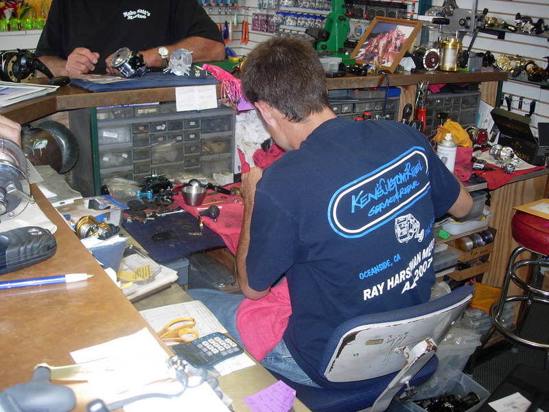 wes is the guy that works on all the reels. he does an excellent job and his work includes drag upgrades with cal's grease and carbontex drag washers, bearing upgrades and handle upgrades. from anywhere in california, it would be a very simple matter of shipping you reels down a month ahead of time. you could get your reels serviced, get new topshots and load up on tackle all in one stop. his phone number, btw, is 760-967-7335. i had a chance to talk to wes and was very impressed. i service 100 reels a month, he works on 100 reels a week!!!!!