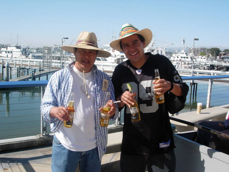this was funnier than hell! eddie bought joey a beer, and joey bought eddie a beer. so both of these clowns are drinking on the walkway, at 9am. the lady that sold them said they could drink anywhere on the sidewalk but not to take it into the parking lot or out on the street.