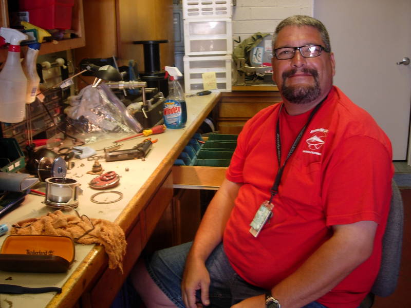 meet john! he does the reel repair for the landing. great guy, picked up a few tips from him, offered a few, and left him with a set of kolekar handles to check out.