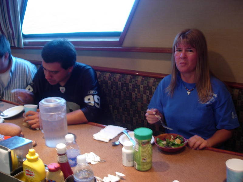 here's our first dinner as we're heading out of the harbor. bev and joey.