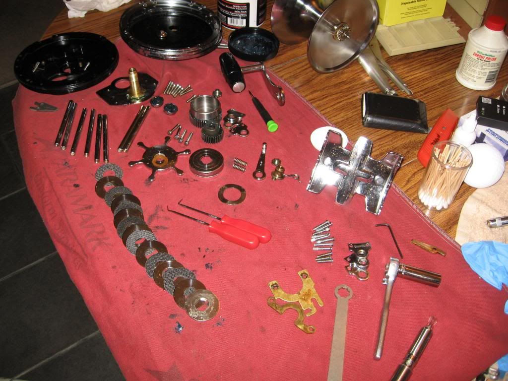 The new drag washer kit from Scotts is a tad thinner than the old metal washers. I measured some and really couldn't tell a difference on a single washer, but when they are all stacked in. I can fit an eight stack of .120 cf in there. With the stock washers, that last key won't seat all the way. This particular reel was in really good shape, the clicker is a little sloppy, but still works good. all the parts just needed a wipe down. All I had to really use brake cleaner on was the gears and the bearings. Just a good spray and scrub with the toothbrush to remove the old grease packed in the teeth. It still had the old 5 stack asbestos in there. Not any more. ;)