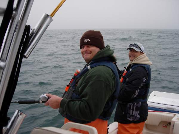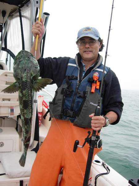 the starboard side of the boat was pretty hot.  not much happened to port, not sure why!  we finished out the day wiith 4 lings, 2 cabs, and 48 assorted rockfish.  we got bounced around pretty badly on the way back because the winds had really picked up.  i ended up running the motors all day.  i had at least one motor in slow idle reverse to slow down our drift.  it made for bouncy fishing.  still alot of fun.