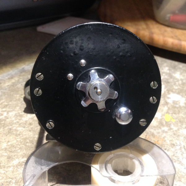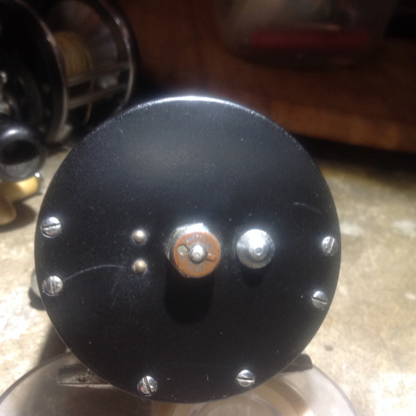 A Pflueger CAPITOL No-1985. A, for the most part, well made conventional. Quick take-apart feature with post knobs on one side to hold the head-plate. A tough made eccentric/free-spool system. The pinion has a interesting gear attached to it which meshes with it's twin on the spool. The pinion's large, the main's relatively small for a 2.5:1 ratio. The spool bushing's function great. Needs some kinda lock for the handle nut. The metal parts on this puppy are pretty thick for the most part. The frame is all posts, using 2 heavy duty ones for the stand---not the strongest way to do it. This'un could probably work as a 30lb. reel, but would be better suited to 20-25lb. duty.