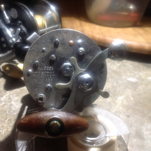 An older lookin Ocean City "JONES BEACH". Supported in 2 pics. by the common and kinda futuristic looking, late 40's "1600". No anti-reverse and no drag star for the Jones Beach, but its gotta good functioning free-spool and clicker. Also no letters or numbers anywhere on the sideplate.
