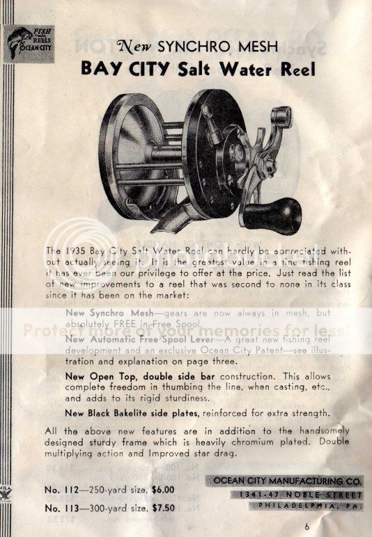 The model you posted is the Bay City, Model 113--300 yard reel. Here is a scan from the same 1935 catalog. This is a common Ocean City reel with a low value. A collector would add this to his collection in the box in mint condition. A used reel would have a rough time bringing $25; mint in the box might bring $50 to $75.