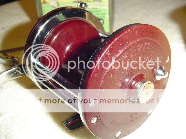 This is pretty much the reel you have pictured. Here is the reel from a 1959 box. Maroon with a white handle.