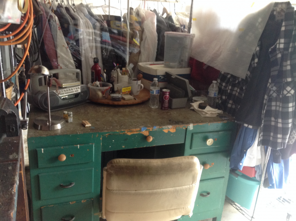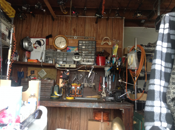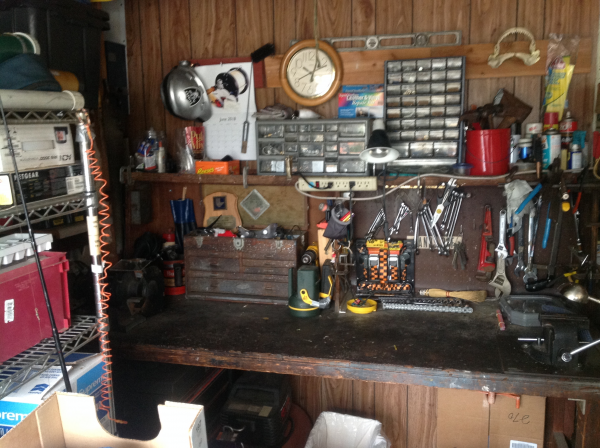 Truely a "man cave". A dark corner of the garage at my wife's house with the work bench my Dad built when I's 2 yrs. old(I really love this work bench). It's got onea those old wooden antique tool boxes from Grandpa and somea his tools. I can't hide there, but it takes people a-while to find me and "out of site, out of mind" works sometimes. Also, the desk where I do detailed stuff.