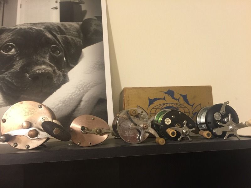 Told him I'd repair his old Penn 155 for him, so he tossed me a few reels out of a random bucket in his workshop lol...I've only cleaned them up, they all work, but I plan on just displaying them. Thought I'd share a pic of them.