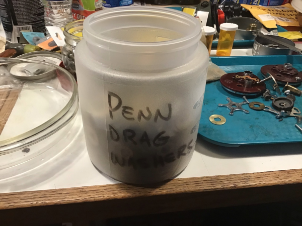 Here are 2 years of old brass Penn drag discs.  Still good — just need cleaning as described.  Around 7-8 pounds.