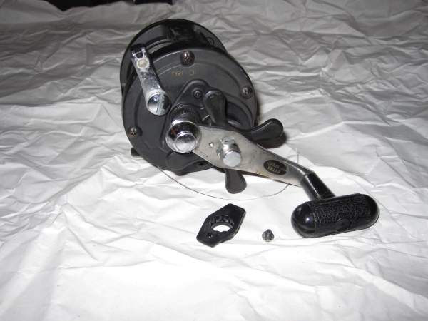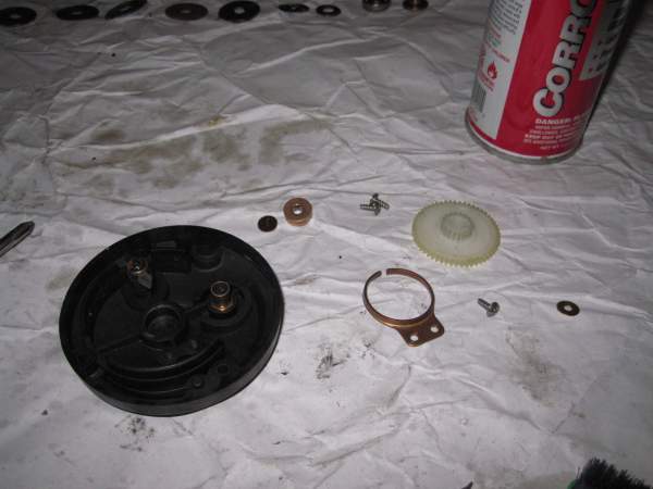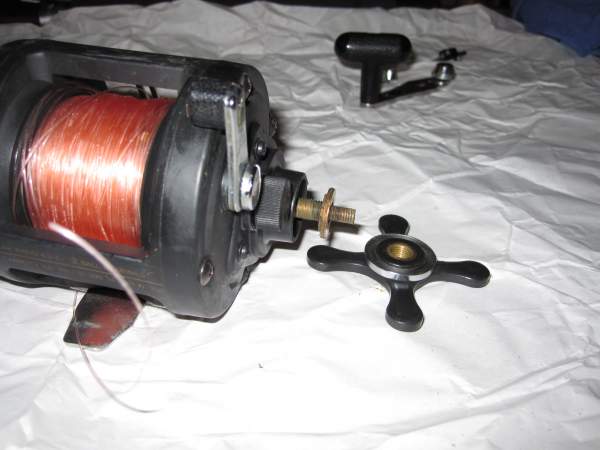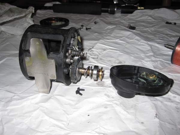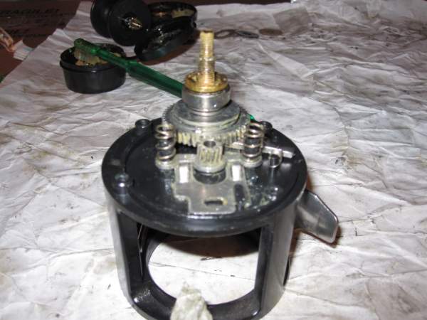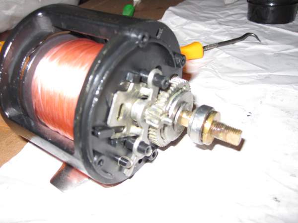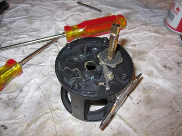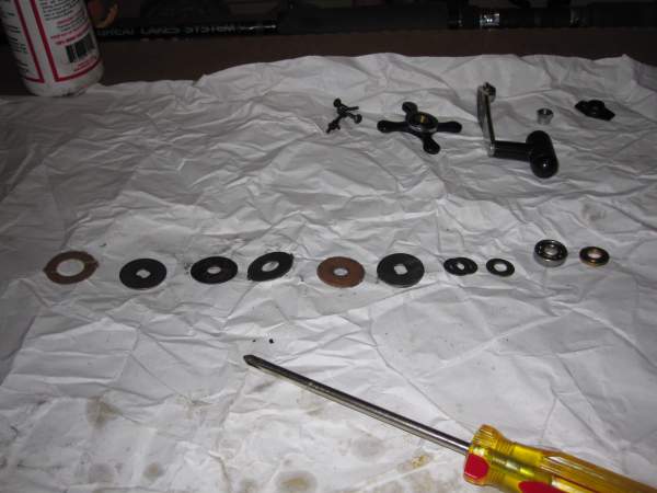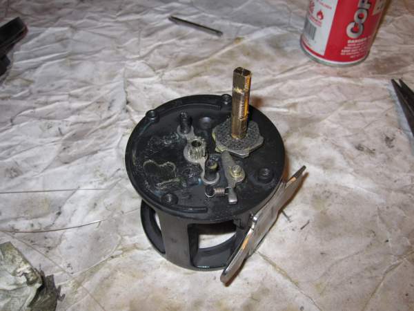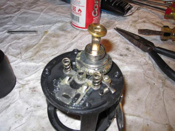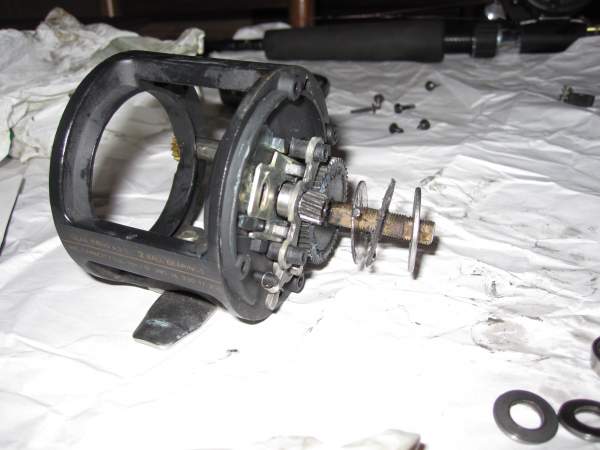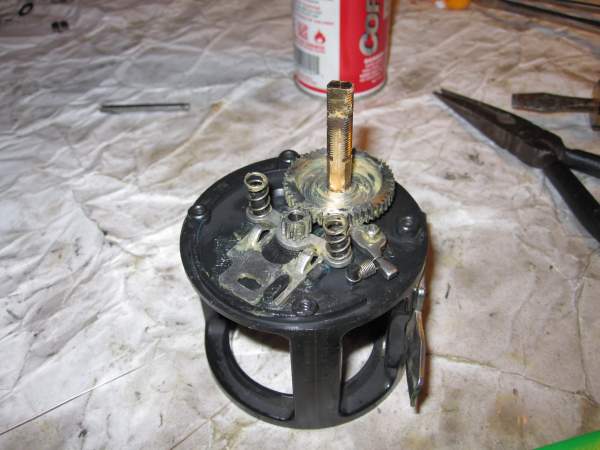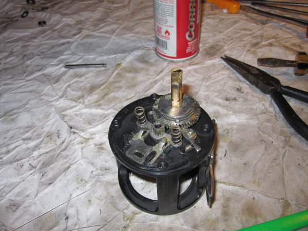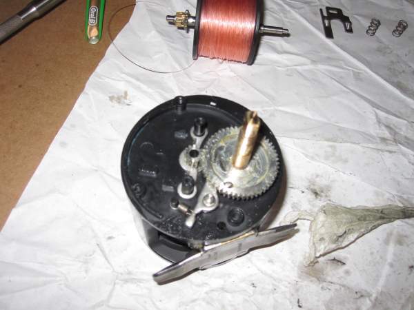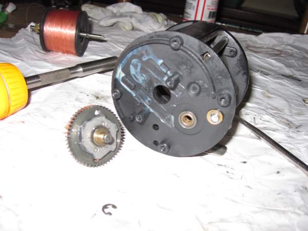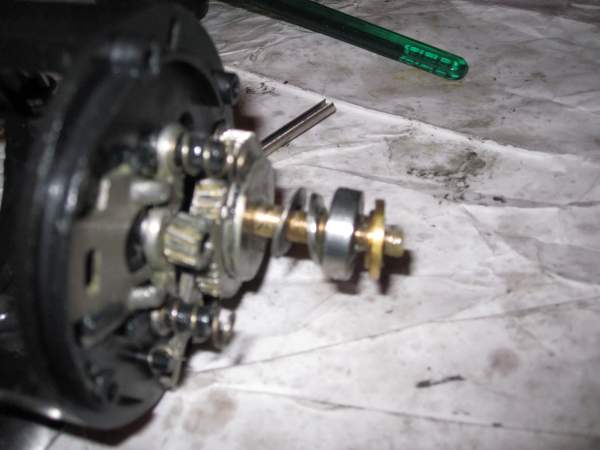 Here you can see the shaft with the anti-reverse washer, drag washer(not visible) and the crank gear. retaining spring in the foreground. In this case I left the crank gear, anti-reverse washer, & drag disc on the shaft then removed them once the shaft was removed. Either order work equally well.