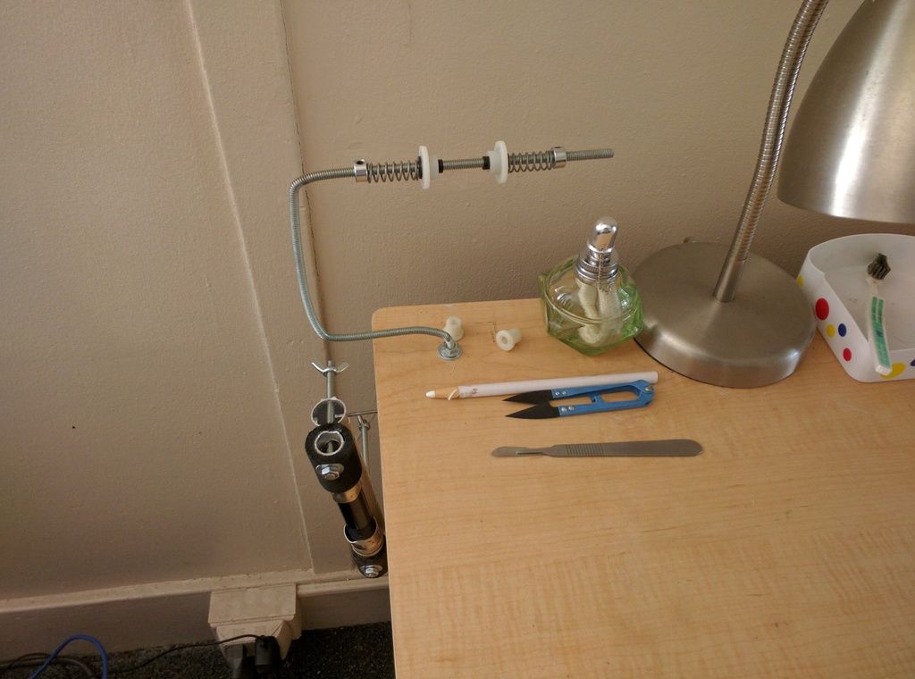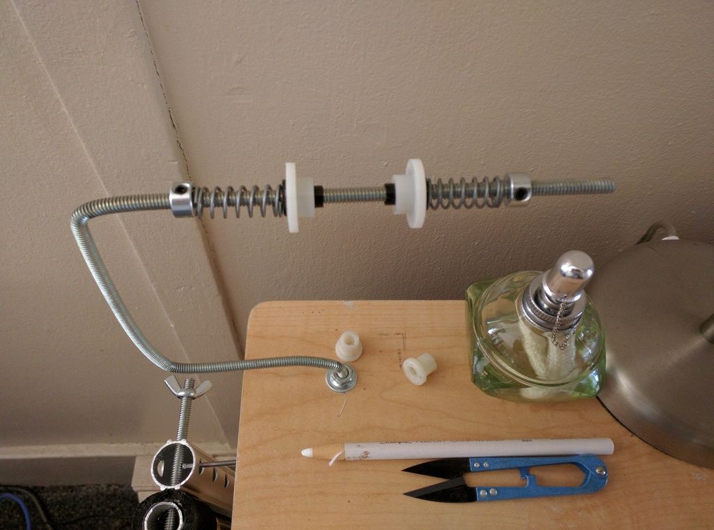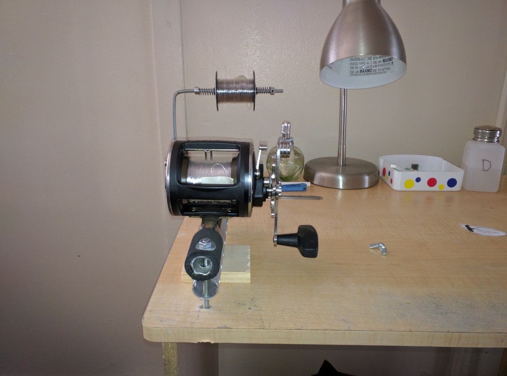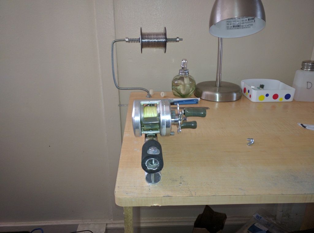I see lots of posts recently regarding line winders. I thought I'd show you mine. Keep in mind I am financially and and space challenged (live on SSI), so I had to get creative. I bought a used desk at the local thrift shop for 15$ that I use for my "bench". So I went to the hardware store and bought a length of 1/4"x 20 all thread and bent it to shape.I got 2 springs, 2 1/4 collars with set screws (came with the allen key), and some nylon bushings that will fit most spools, and some wing nuts. The section that holds the reel is removable so I don't take up all the real estate on the bench when I'm not using it. I can do small baitcasters and large ones by simple putting a 1/2 inch block under the reel seat so the handles will clear the bench. The only thing I want to add is a "waving rod" so I don't have to handle line with my fingers if winding an open face reel. I'm gonna do that with a piece of wire with a loop at the top, but that's for later. With the springs and collars I can put LOTS of tension on the feeder spool if I need to, because I primarily use braidl. Here are some pics. Hope this helps someone out.