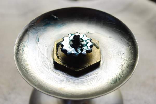 A chromed brass flange pulled off the arbor of a 500 spool;