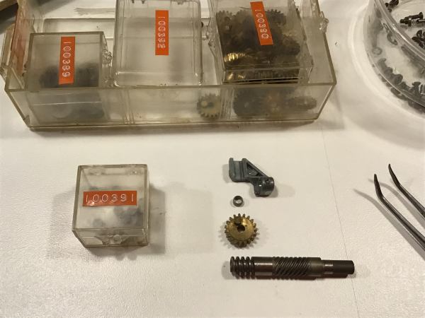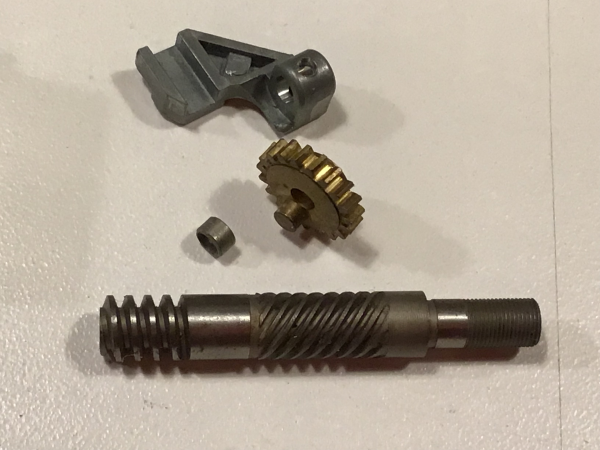 We have a machined spiral worm pattern on the bottom end of the steel worm pinion gear — which in turn drives a brass worm gear — that then operates the spool oscillation slide.