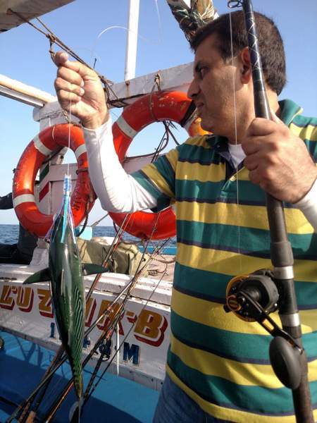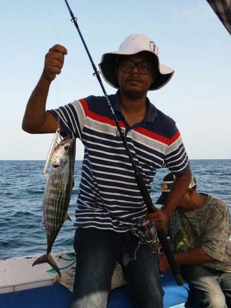 We reach our first structure and start jigging. This place is infested with bonitas. Basit catches a striped bonito, his first ever fish on jigging!
