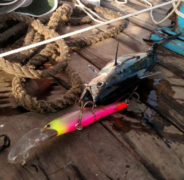 a small kawa kawa takes a lure trolled for mahi mahi