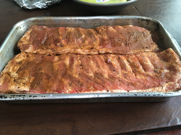 Four racks, untrimmed with sinew removed and rubbed with super secret dry rub 24hrs refrigerated.