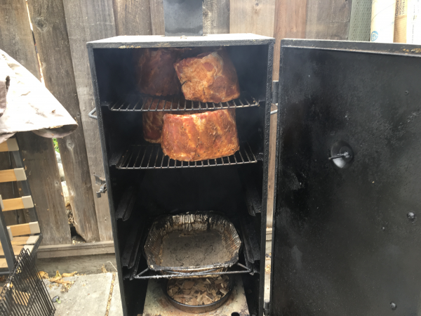 In the smoker  at 225 degrees at 11:30 am.  Dinner bell at 6:00 tonight.