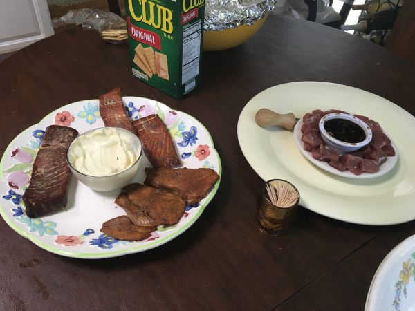 Assorted smoked fish with wasabi mayo dip.  Sashimi blue fin tuna and soy wasabi ginger dip.