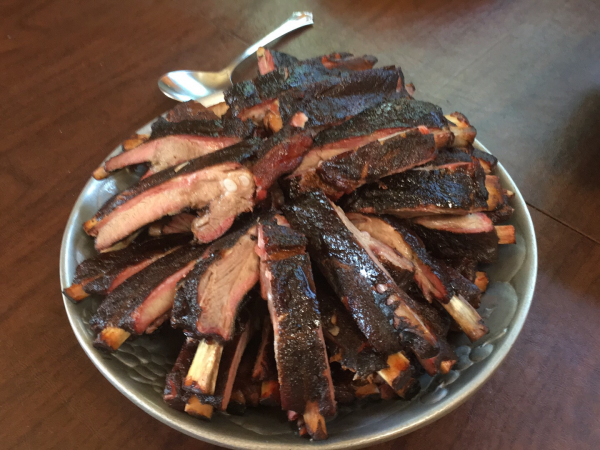Update, the 3 on the smoker is done, off they come, cool to handle it, then on a rack in a deep baking pan with about a cup each of apple juice and Arizona sweet tea.  Layered and tented with foil.  I try to seal it up good.  This is step two in the cooking process, steam them for 2hrs, I found that is a bit to long, they'll fall off the bone before I get to step 3, finishing them.  So I cut it back to 75-90 minutes at 325.  Then they will rest up again for the final finish which is 10 minutes on the grill. Step three in the original recipe is 1 hr back on the smoker, I like to just toss them onto a good medium hot grill and let them dry and finish up.  This is also a good time to sauce them, but since I'm slicing them up and piling them in a bowl. I don't sauce until they're in the bowl.  Sometimes I just put the sauce on the side with a couple or three options on the sauce, everyone has a flavor they like, the grandkids really like teriyaki and I'm not that fond of it on ribs, so sauce on the side this time too.