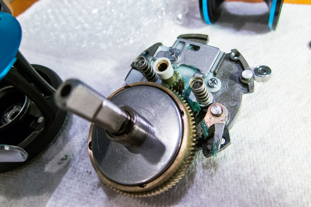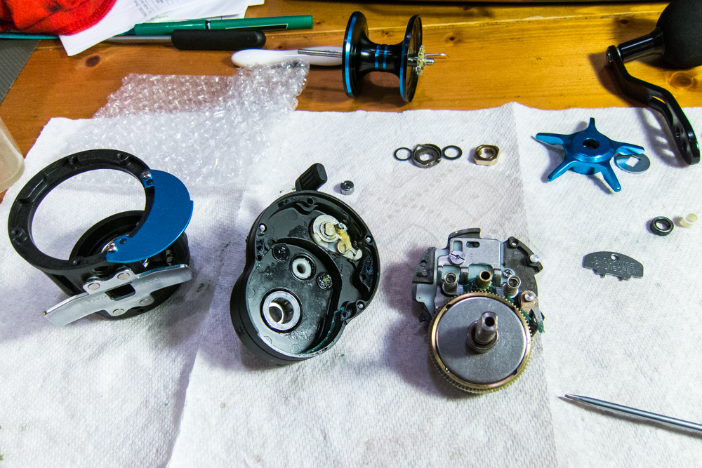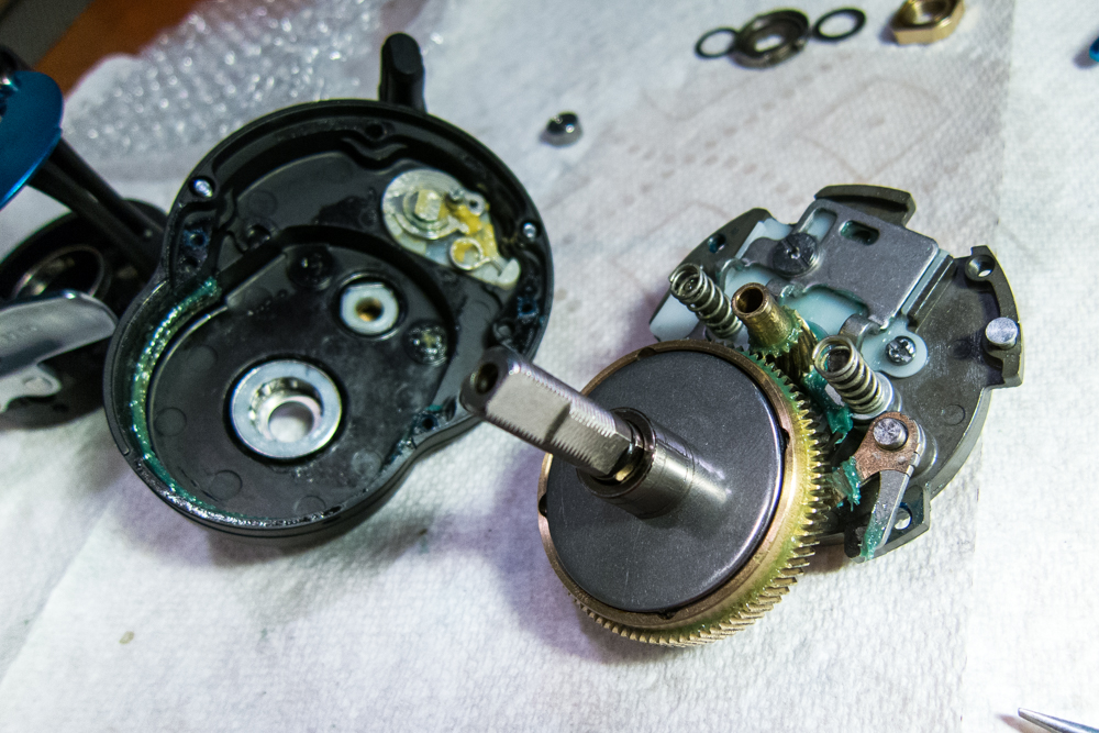 Here is the Saltist 20H after partial disassembly.  The new metal set plate from the Saltiga is in place.  The bushing is in the center of the handle side plate in the middle of the photo.