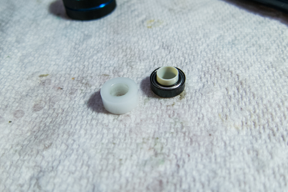 Here is the bushing next to the new bearing (CRBB, it appears) and the plastic collar.  You can see how the missing washer would presumably make the difference in filling in the dimensions of the bushing.