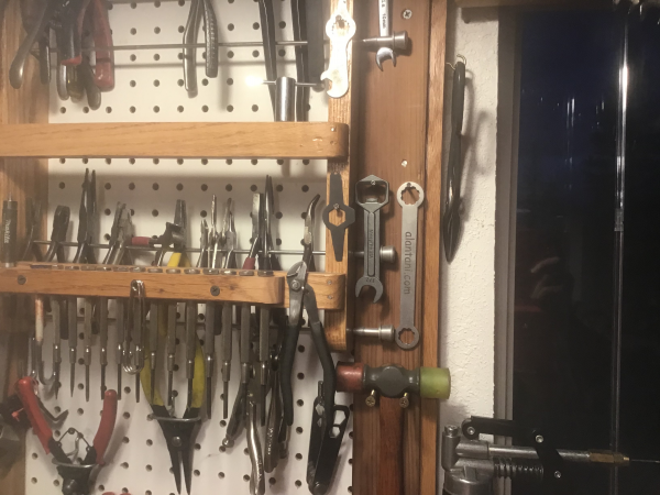 The Alan Tani wrench stays in the inside upper shop, next to the bench that I do most of my work on.