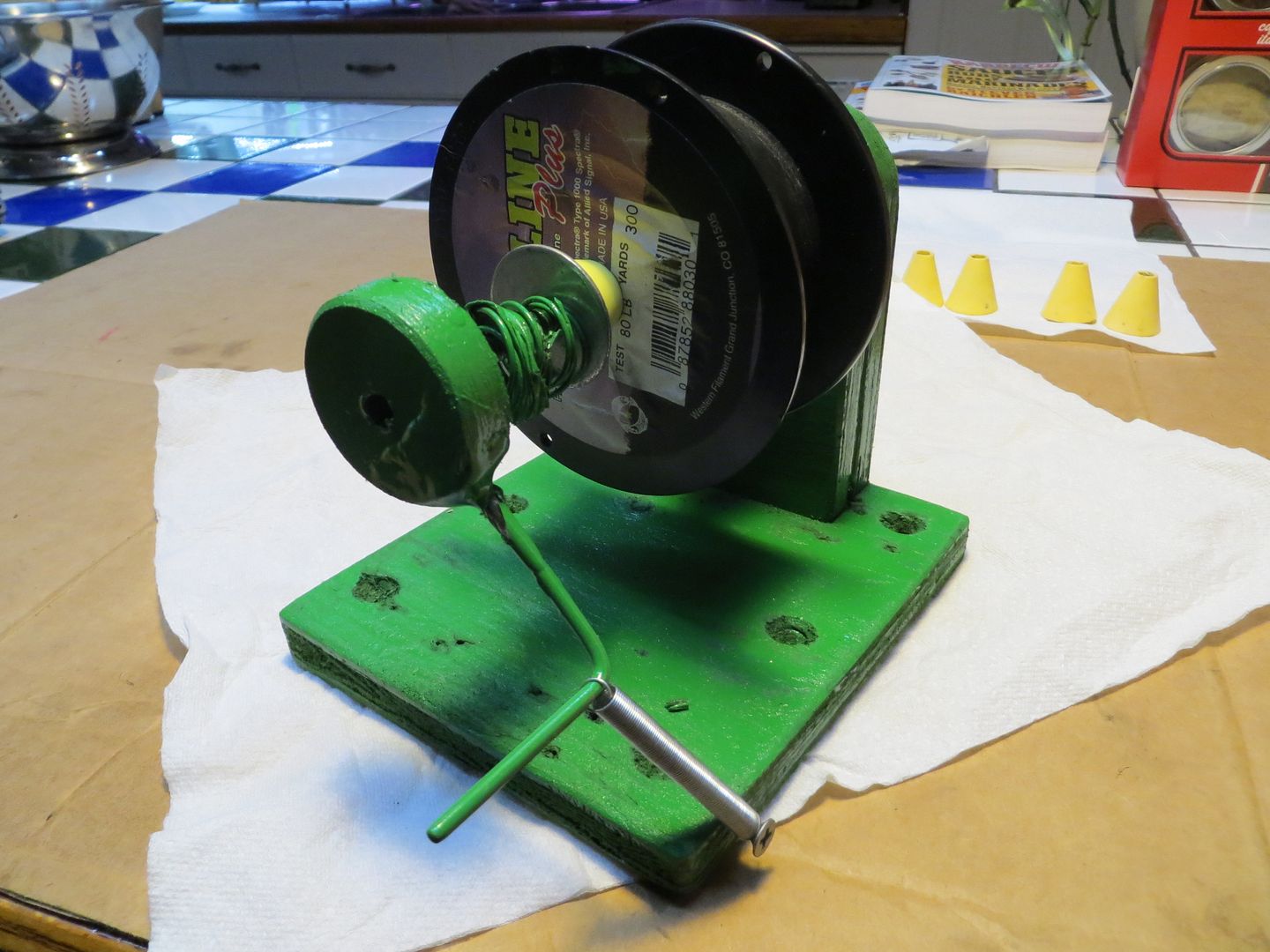 The average expected size spools of line should be part of the design.....as I,m not spooling lots of mono for my fishing the 3x4 size spools seem adiqiute for the desighn pictures.