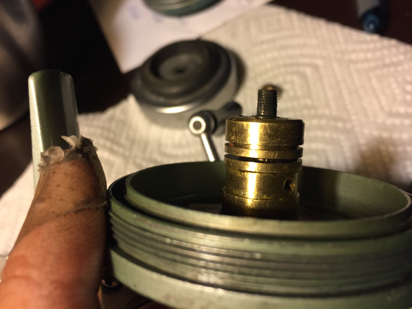 Here's some pics. Fred, the one part I am wondering about upon reassembly is the orientation of that thin-wire clip that goes on top of the spool. There is a small slot part of the clip goes in, but I'm not sure which part. The functionality of the reel seems fine as far as winding, drag, etc. The only thing I'm stumped on is why when the button is pressed and the plunger and spring are depressed, they don't stay that way. If you see anything that catches your eye please let me know.