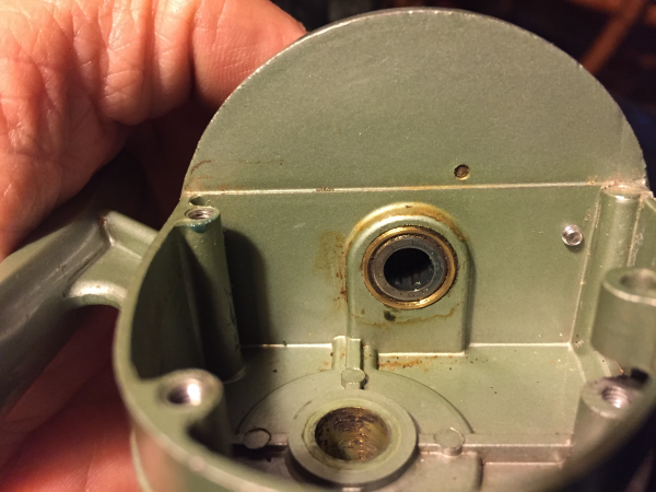 Here's some of the inside. To answer the question about the free spool button there 2 slots in the main shaft on the end. The top slot hold a big c-clip, the 2nd slot has a thin wire clip in it that keeps the free spool bottom from popping out until the handle is turned. That wire must fall out pretty easy and disappear because mine did. I made a new one out of stainless wire.