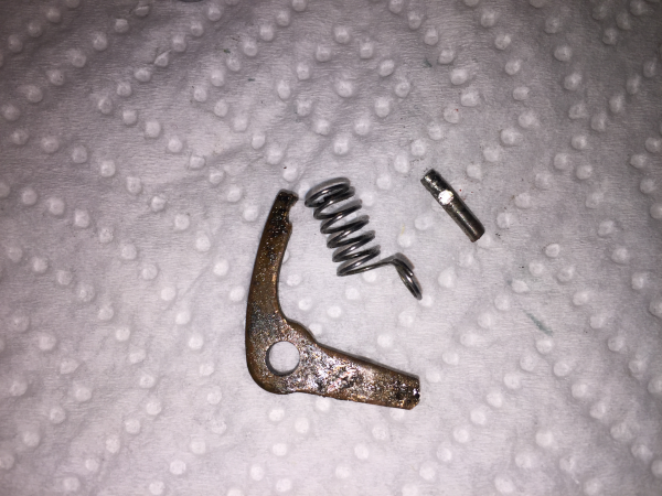 Next I dremeled the sideplates, multiple times to get everything to fit, not much left there but I think enough. I drilled a hole (well 3 holes, 3's a charm right?) for a pin to hold the end of the dog spring. A little filing on the pin for a groove to hold the spring on the pin. Then some filing on the dog to get it to fit. Put it together using the bridge screw to pivot the dog. It actually works!!