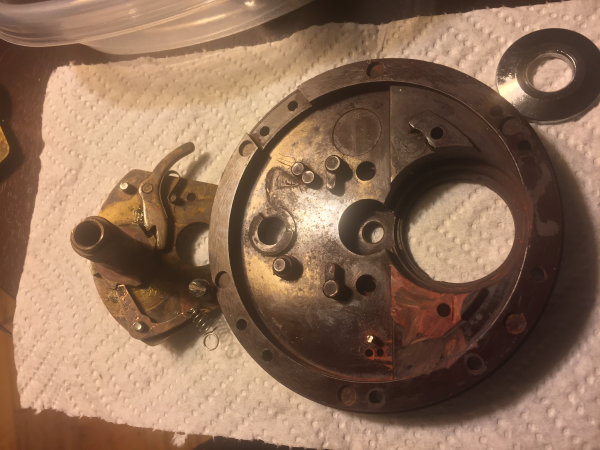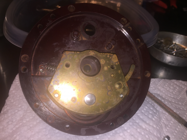 Thought I'd try adding a second dog to a 349h. I had some extra parts laying around from doing the Cortez kit, found a NOS Newell spool for cheap on fleabay (figured it wasn't a narrow 6/0 as listed) a frame from CC and a drag insert from motive fab. I don't have the tools or skills for anything fancy so it's kinda of a hack job. Anyway I had a side plate to trash, a dog from a 49, a yoke spring and the gear sleeve pin from a 9/0.