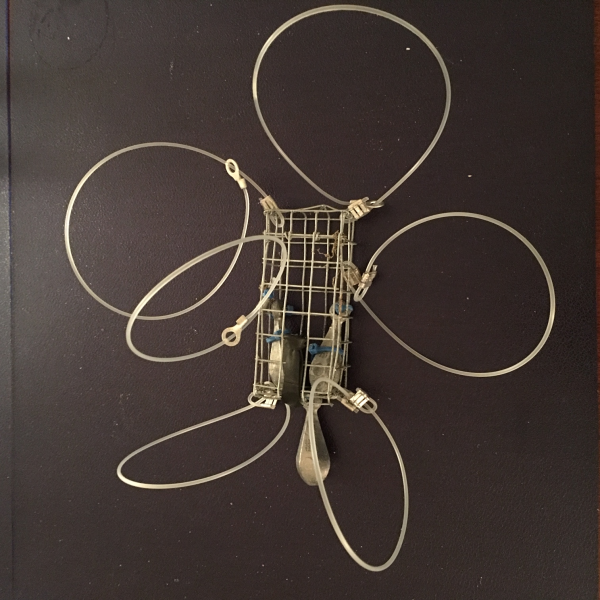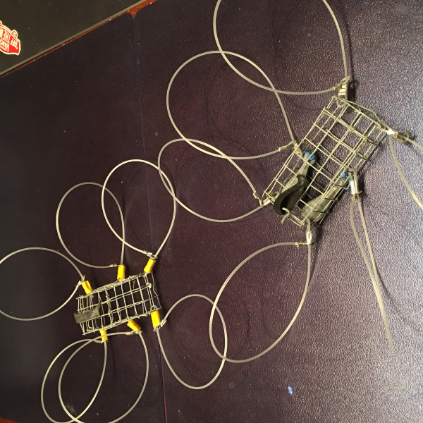 here's a couple of my earlier snares...  I initially learned how to make them from Fisherman's Life and ScorpionTube712 on youtube, but I've been sort of modifying the shape and size, and changing the way to make the snare loops every time I have to make a new one, which is every couple of trips..   1) rock crabs tend to destroy the hardware cloth.  and 2) you lose one now and again from abrasions in your braid.