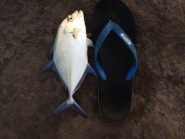 Ran into some Omilu's on the reef. 2 for 3 and then the Needlefish started grabing the jig. Check out the blue on the fins. Kinda like the one in wailua boy's last picture. She had eggs in her, pre-spawn? or on the process? Had several unidentified bait fish in the gut, so probably gearing up for the spawn. Hard fightin indeed! Don't think I could land a 5 lb'er on my light rig. This'n probably 1 - 2 lbs.