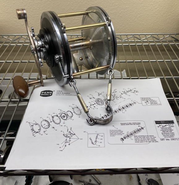 Only thing I can add is that it has the flat spring for the dog.  Which in reading the schematic from Mystic says that was only on the early models.  Metal drag washers were brass/bronze.  The handle nut was unusual too.  My Tani wrench did not fit.  However the smoothdrag wrench if it is there's did work just fine.  Knob has been painted, twice.  Looks like the base coat was purple, then the brown color.  The knob under it all appears to be black.  If I go at this with some mineral spirits can someone give me some guidance on how to do it without potentially damaging the original color if it is wood?  I think I would be safe if it is the plastic know as they are solid colored, I think.  But if it is wood...