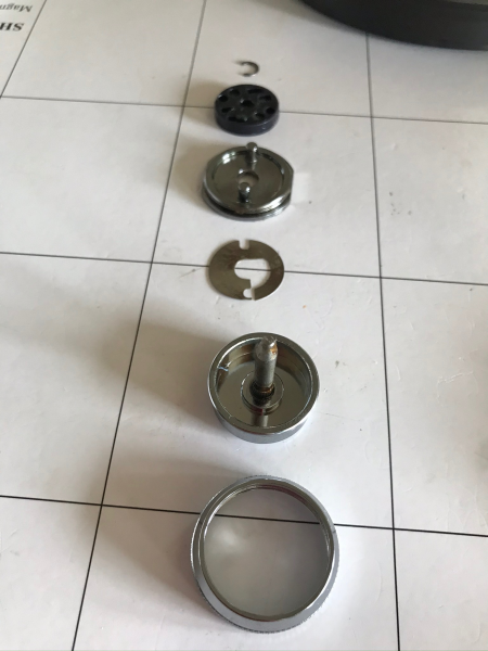 I, and others may have not thought that the thin round disk was a keeper/ circlip.  It sits on top of the shift round part with the springs.   Simply pry it around the studs that stick up that are apposed as this is keeper.  After lifting it up, the black plastic ring w the springs can be pried up.