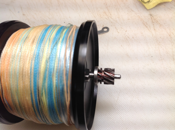 At roughly the 12 O Clock position on the spool shaft you will see one of the pie shaped bevels that help the pinion to drop onto the spool shaft, and: