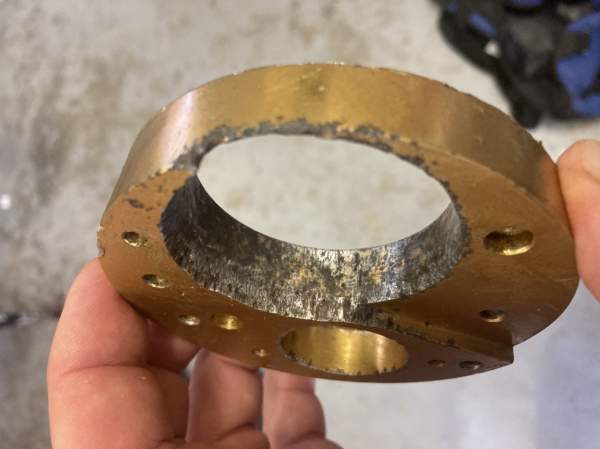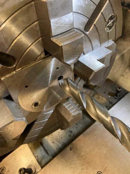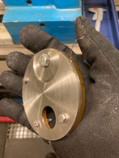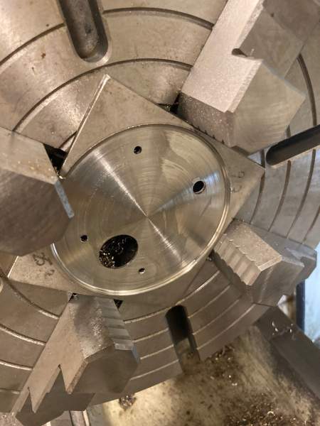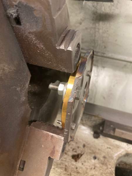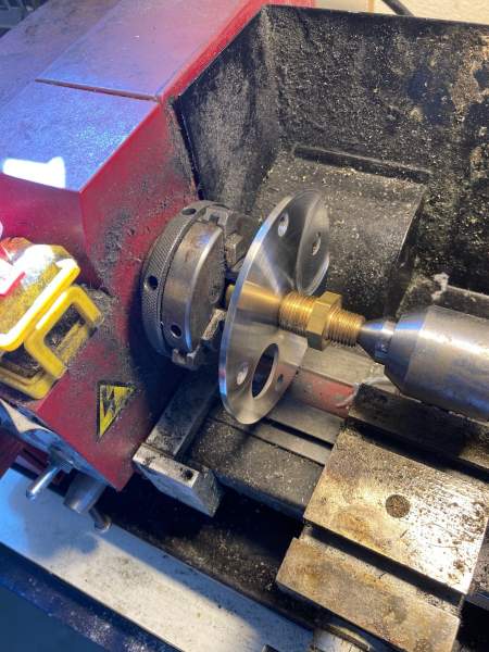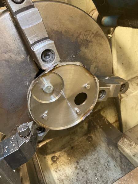 I was informed from home, that the parts from the USA had arrived (Many thanks Tom and Mystic), so this meant a slightly easier process to finish this plate off. Knowing I had all new anodised bridge plates, meant I could used the corroded plate as a mount for trimming the plate down to final diameter, by mounting it on a 3-jaw chuck. Chucks were swapped off the lathe, 316 plate bolted to the corroded bridge piece, and trimmed off the excess material corners with the angle grinder, before mounting back on the lathe.