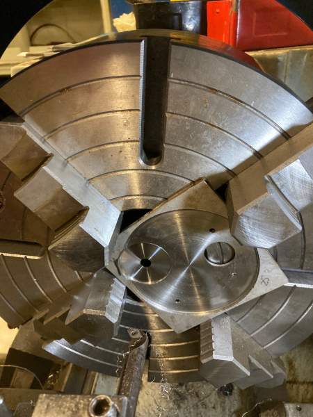 Pretty sure in this pic, I have skimmed away the rest of the plate, ready to trim off the excess material outside the of the plate diameter to allow for clamping in the 4-jaw chuck.
