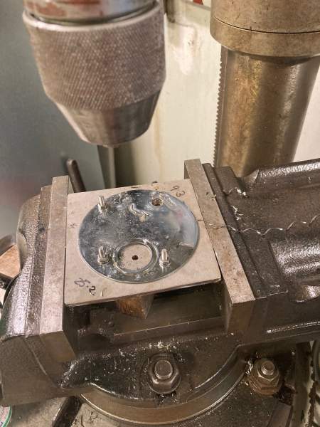 First up was to transfer punch the hole patterns onto the 5mm plate. A punch had to be skimmed and a couple of delrin inserts were spun up to make sure the punch located perfectly the centres of the crank and preset dial openings. I didn't take any detailed pix of this part unfortunately, other than when I  drilled the holes on the drill press. Note the M4 bolts used to bolt the original plate to the stainless blank.