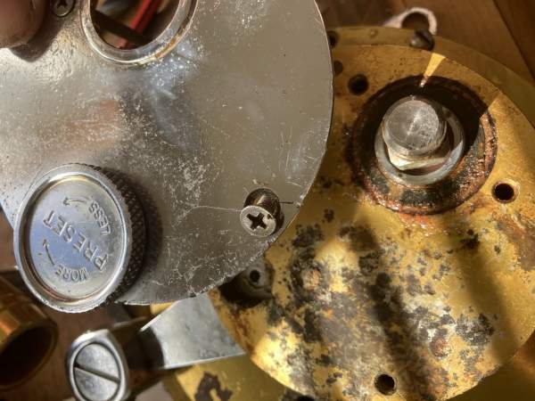 Another issue was the outer bridge plate with the preset dial was cracked, and the crack was beginning to work its was across this piece to the point it was flexing, and would eventually break. You may be able to see it working across the screw hole below