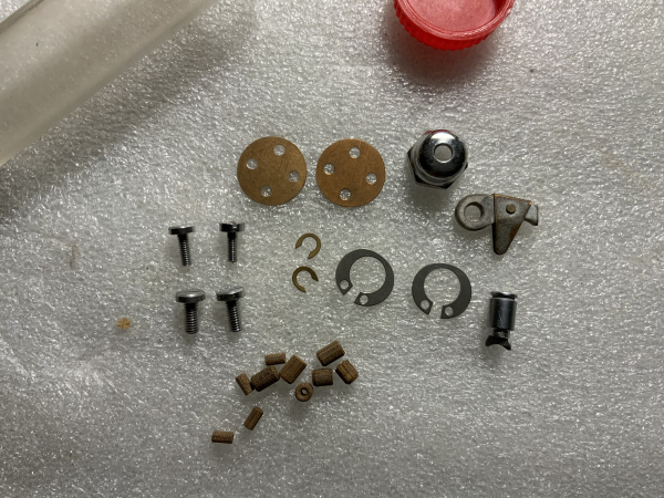 4) the small tube with no marking. Note that the levelwind pawl is much shorter than the one on the left side in picture #3 and a pawl cap screw is included with this one, the spare screws are much shorter and one is cut like it's a thumb screw, and 2 rubber dealies; an o-ring and what looks like it'ed work as a bail stopper on a spinner, and a grey plastic thingie(cap for something?).