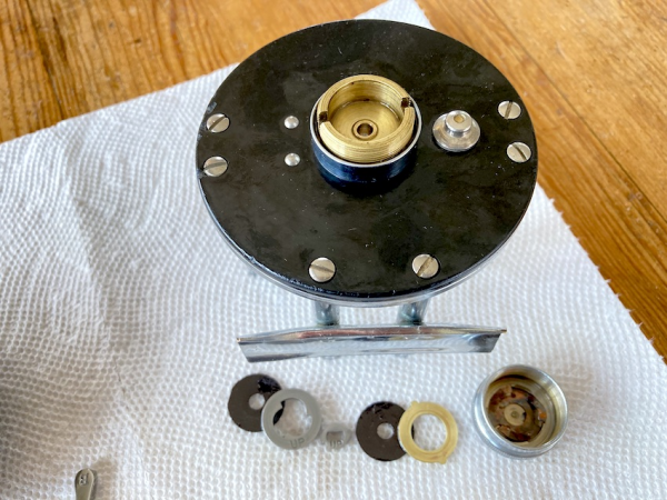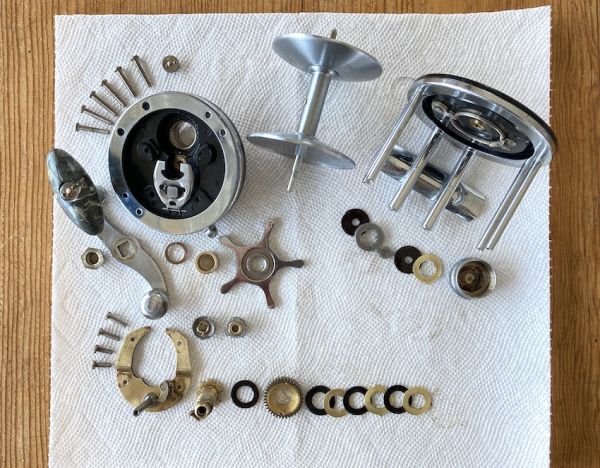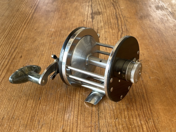 Pflueger 2048 Sea-Vue, an 18oz. 250yrd "surf-casting" reel from the late '40's into the '50's. This is the same reel as the Ohio (1978) but with one of Pflueger's several permutations of their "Mechanical Thumber" AB mechanism. This "MT" mechanism employs "drag" washers that only engage, via one-way cams, when line is out-going.