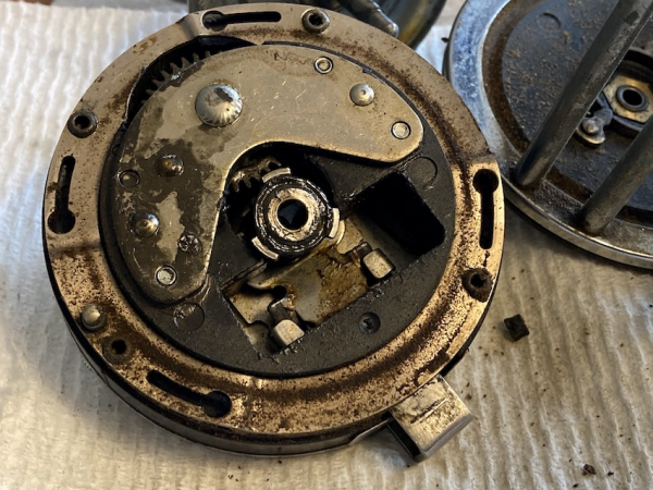 This one came in dirty but cleaned up nicely and is fully functional. Oddly, this is the second Pflueger SW reel that's had a single tooth broken on the ratchet. Although the layout photo doesn't show it, I got brave and took the entire FS clutch assembly apart. And of course, there was a spring in there waiting to spring! Looks a bit like a mousetrap spring. With my pre-photo's I was able to put it back together. Phew! I also have a Sea King, and did not disassemble the clutch, as it's adequate to clean the assembly without taking it off the plate.