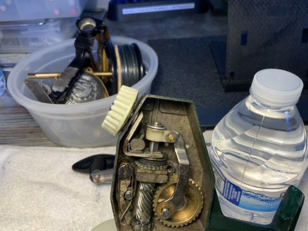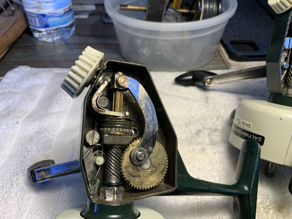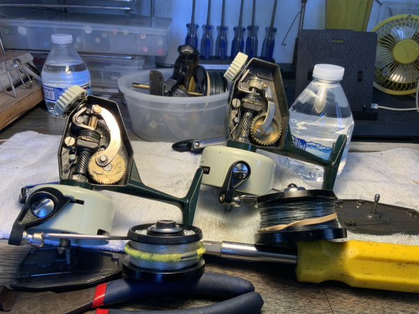 Here's a 6 and 4, I had out after use. Gotta dry-out the rotor cup after FW rinse. Behind those is a Mitchell Garcia 302 mostly apart in the container.(pic.-3). They all got splashed with saltwater, Saturday, then rinsed with FW. The MG is full of emulsified grease and salt crystals😟, whereas the Cardinals never seem to get any water in the gear-box 😃!?!?...