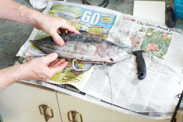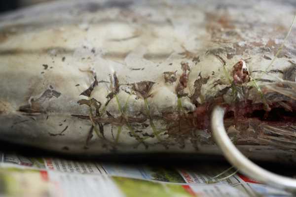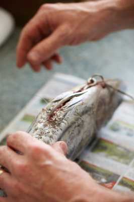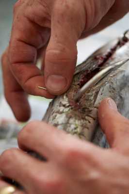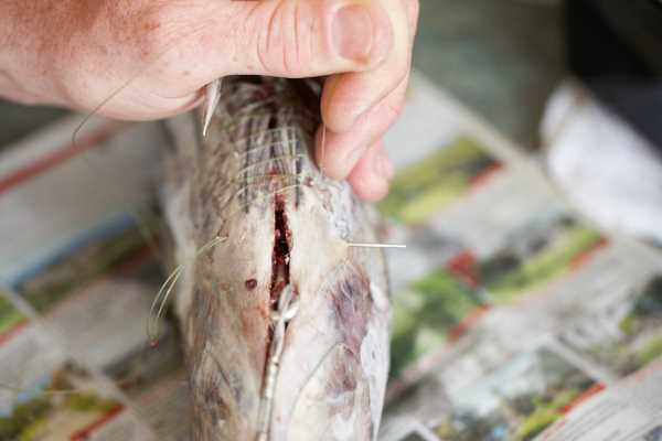 Now open a nice long slit just back from the base of the gills, through to the anal fin.