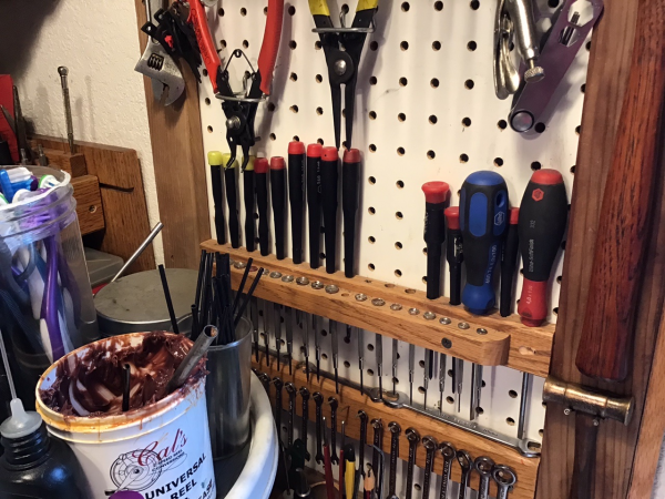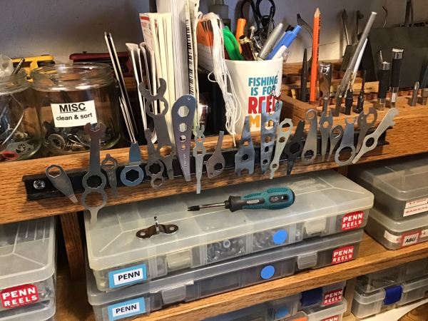 Personally, I made up a complete set of reel tools and spare parts -- it goes on every trip.
